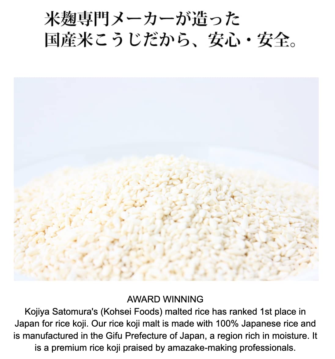 - PREMIUM: Dry rice malt koji made with best-in-class rice from ''Kojiya Satomura'', the No. 1 koji and amazake producer from Gifu Prefecture, Japan, a region rich in moisture. It is highly acclaimed by Japanese amazake-making professionals.