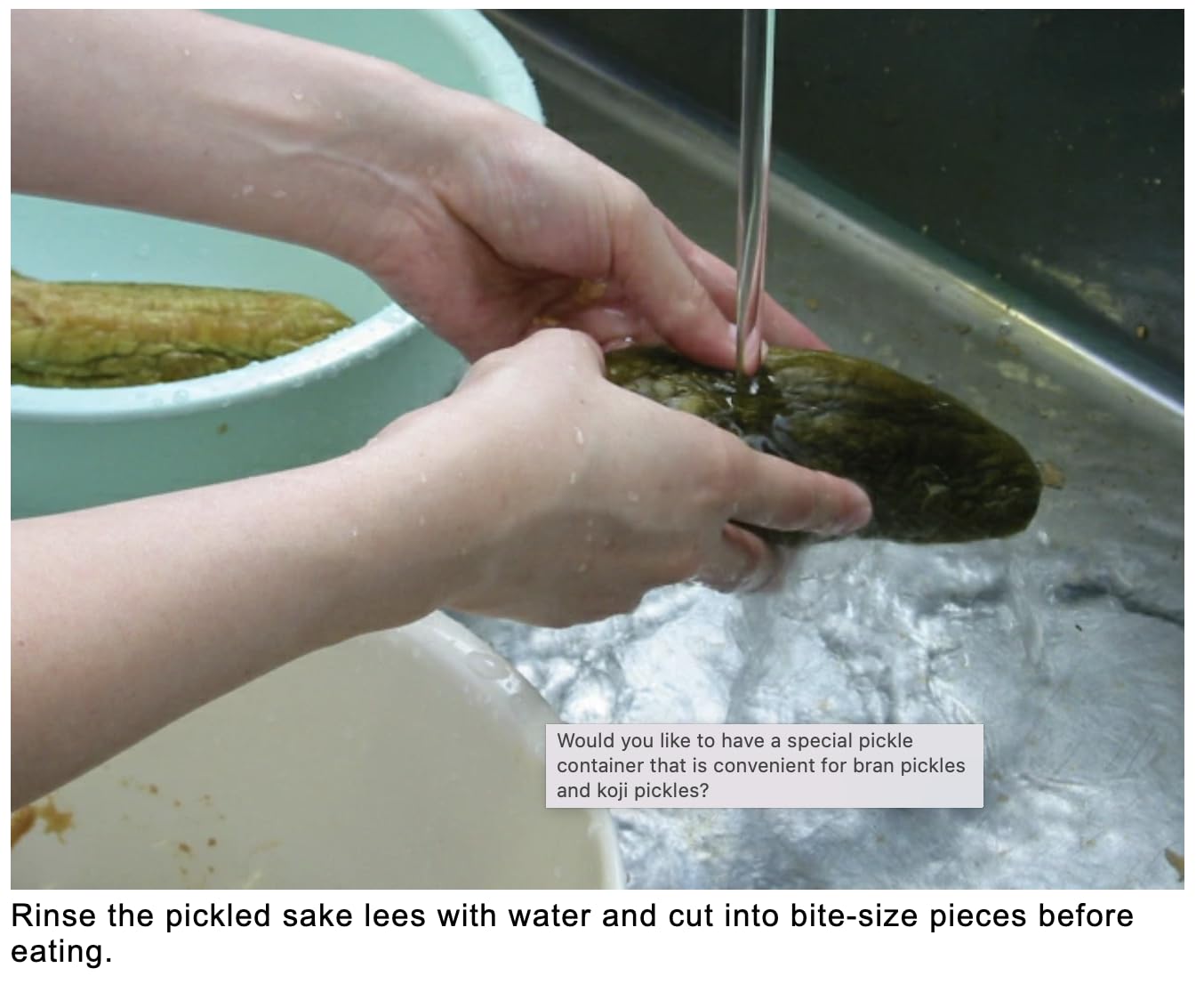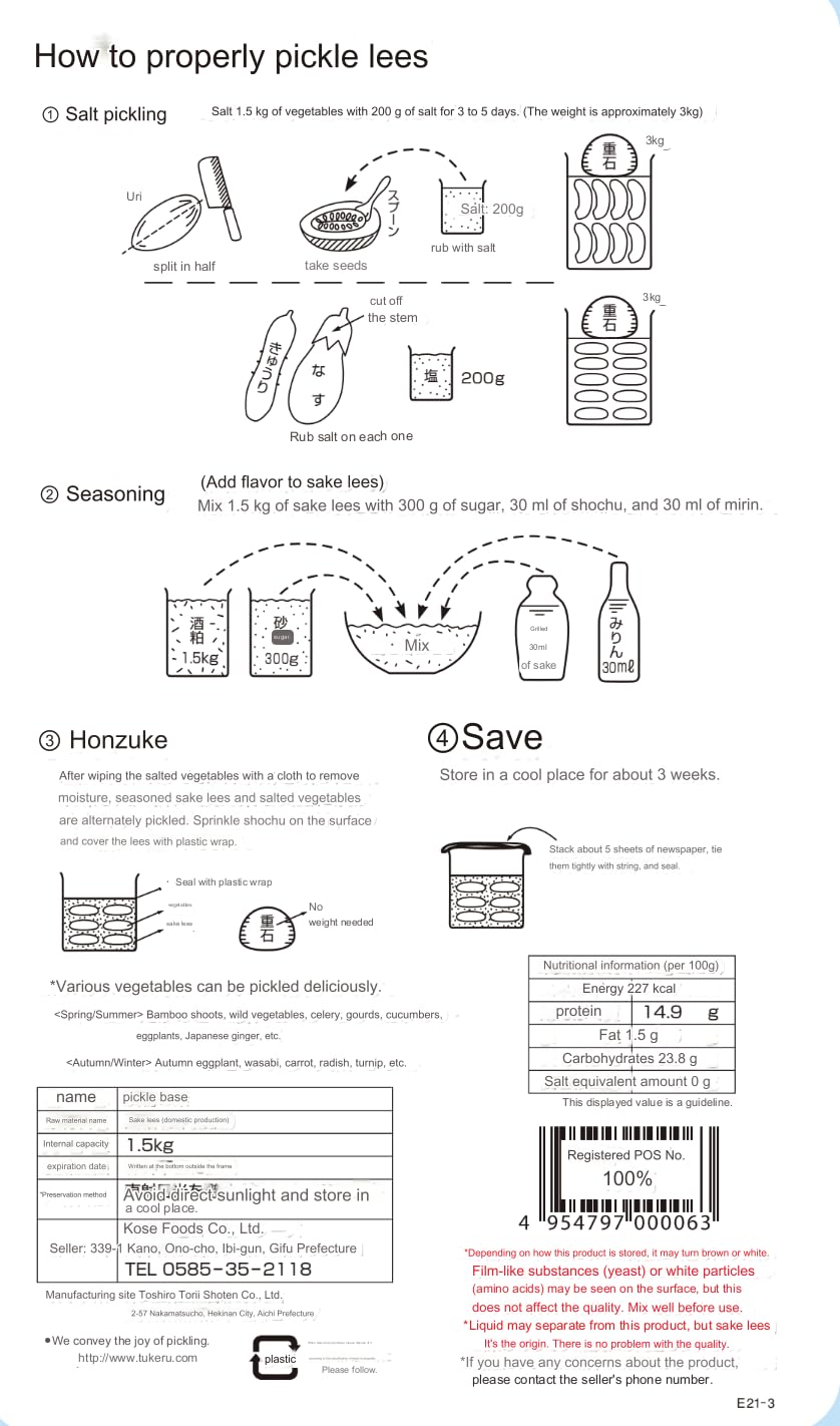 - Pickle delicious cucumbers, radishes, eggplants, melons and other vegetables with this aged Sake Lees.