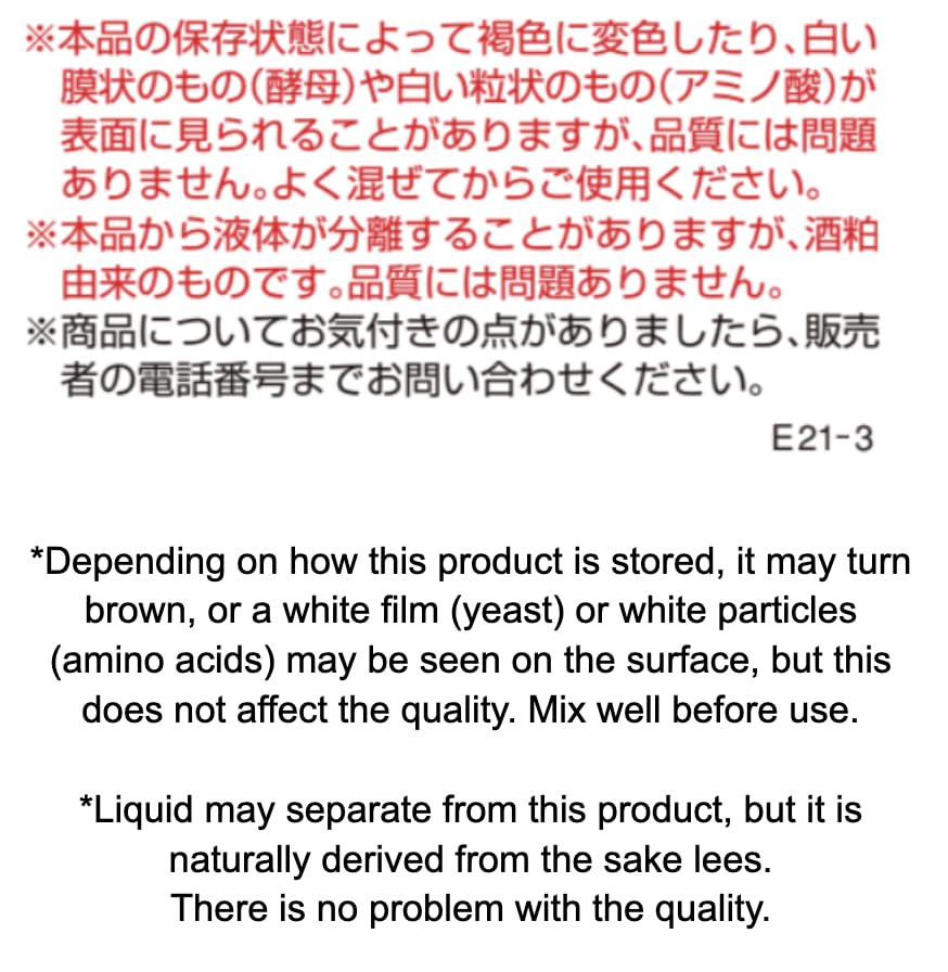 - *Depending on how this product is stored, it may turn brown or white. Film-like substances (yeast) or white particles (amino acids) may be seen on the surface, but this does not affect the quality. Mix well before use. *Liquid may separate from this sake lees product, however that does not affect the quality.