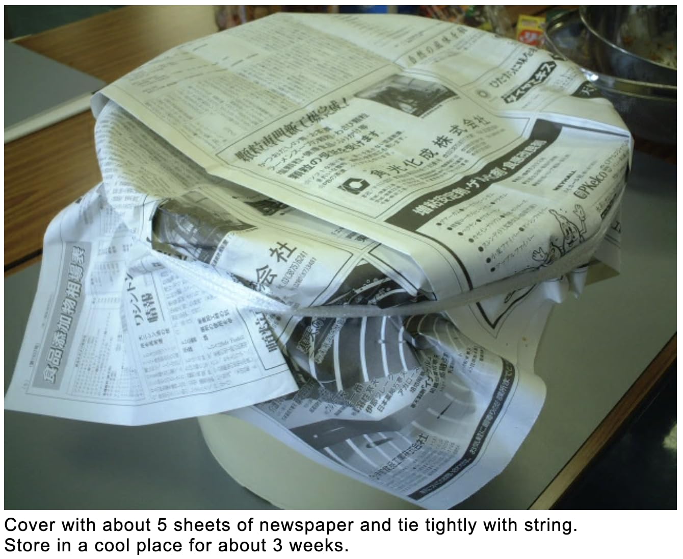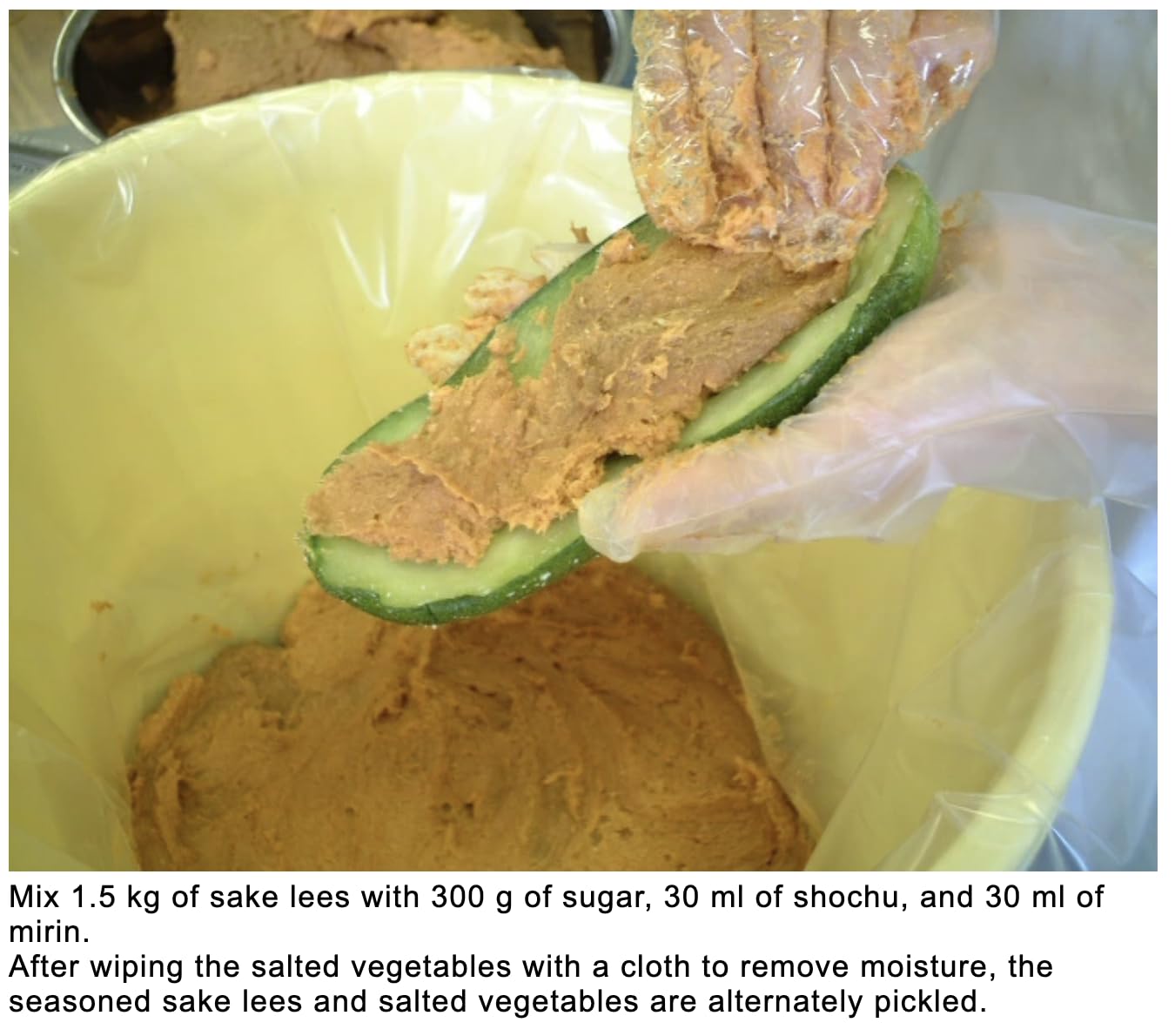 Prepare a large container and add 200 grams of salt to 1.5 kg of vegetables. Let sit for 3 to 5 days. (The total weight is about 3 kg.) After 3-5 days, mix 1.5 kg of sake lees with 300 grams of sugar, 30 ml of shochu (soju), and 30 ml of mirin. After wiping the salted vegetables with a cloth to remove the moisture, add the seasoned sake lees to the salted vegetables Sprinkle some shochu (soju) on the surface and adhere the wrap to the lees. Cover the container with about 5 sheets of newspaper and tie tightly with string. Store in a cool place for about 3 weeks. Rinse the pickled sake lees with water and cut into bite-size pieces before eating.